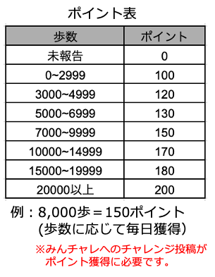 報告された歩数により、獲得できるポイントは以下の通りです。