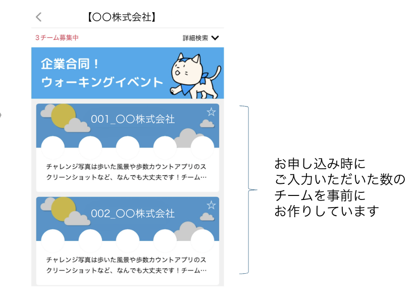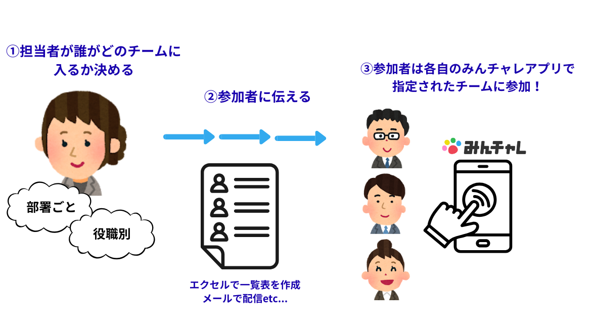 - 担当者がみんチャレアプリ上で参加者を振り分ける機能はございません。(チームへの参加は、参加者様のアプリから実施いただきます)