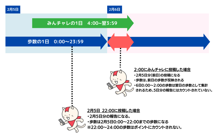 →2/6 0:00~2:00までに歩いていた場合、その歩数は2/6の報告の際に反映されます。