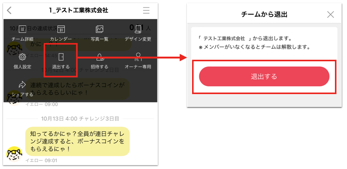 チームからの退出の画面で [ 退出する ]を選択すると、チームから退出し、チームが解散(削除)されます。