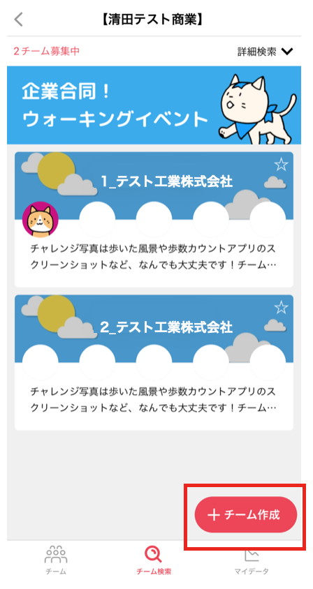 ※みんチャレの参加は1人1チームのみとなります。すでにチームに参加している場合はチームの作成ができませんので、一度チームを退出しチーム作成を行なってください。