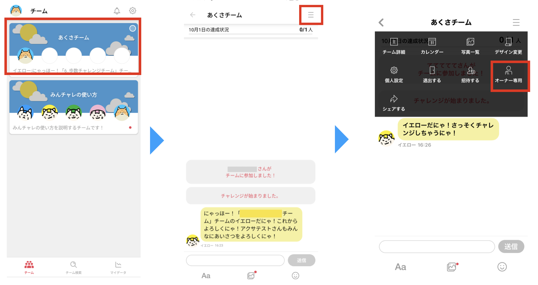 (2)チーム画面の参加チームをタップ → 右上の[≡]をタップ → 画面上の[オーナー専用]をタップ